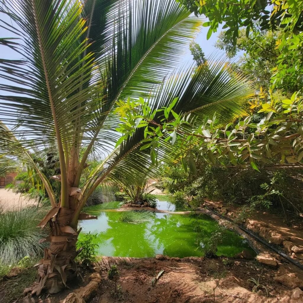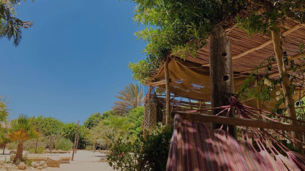 Au cœur du désert de Dakhla, Dar Tawarta abrite un véritable miracle de la nature : un jardin expérimental où poussent des arbres fruitiers et des plantes exotiques. Ce jardin, nourri par une eau sulfureuse vieille de 8000 ans, est une oasis de biodiversité en plein désert. Bananiers, papayers, goyaviers et même caroubiers y prospèrent, défiant les conditions climatiques extrêmes de la région. Ce jardin est non seulement un symbole de résilience, mais aussi un témoignage de l’engagement écologique de Dar Tawarta.